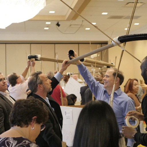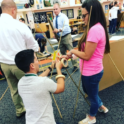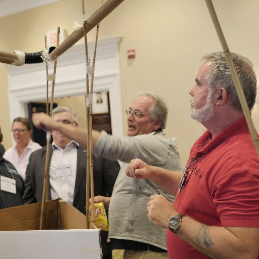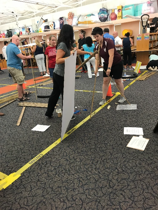 Each team will carefully plan their building strategy using construction materials which may include bamboo, plastic PVC piping, rope and tying materials. Communication and collaboration with other teams is essential, as marbles must freely travel from one end to the other, aided only by the laws of physics!