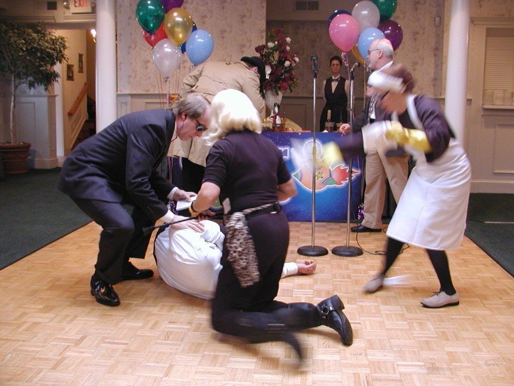 Upon receiving the questionnaire our Script Writer/Director, Bill, will create “The Story.” Bill and cast of actors, three (four) in total, arrive at the site well in advance…